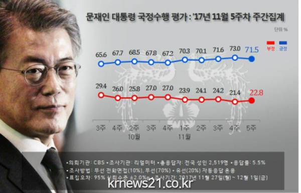 4일 여론조사기관인 리얼미터가 지난달 27일부터 이달 1일까지 성인 2519명을 상대로 조사한 결과(95% 신뢰수준에 표본오차 ±2.0%포인트)에 따르면 문 대통령의 국정지지율은 지난주보다 1.5%포인트(p) 하락한 71.5%를 기록했다.
