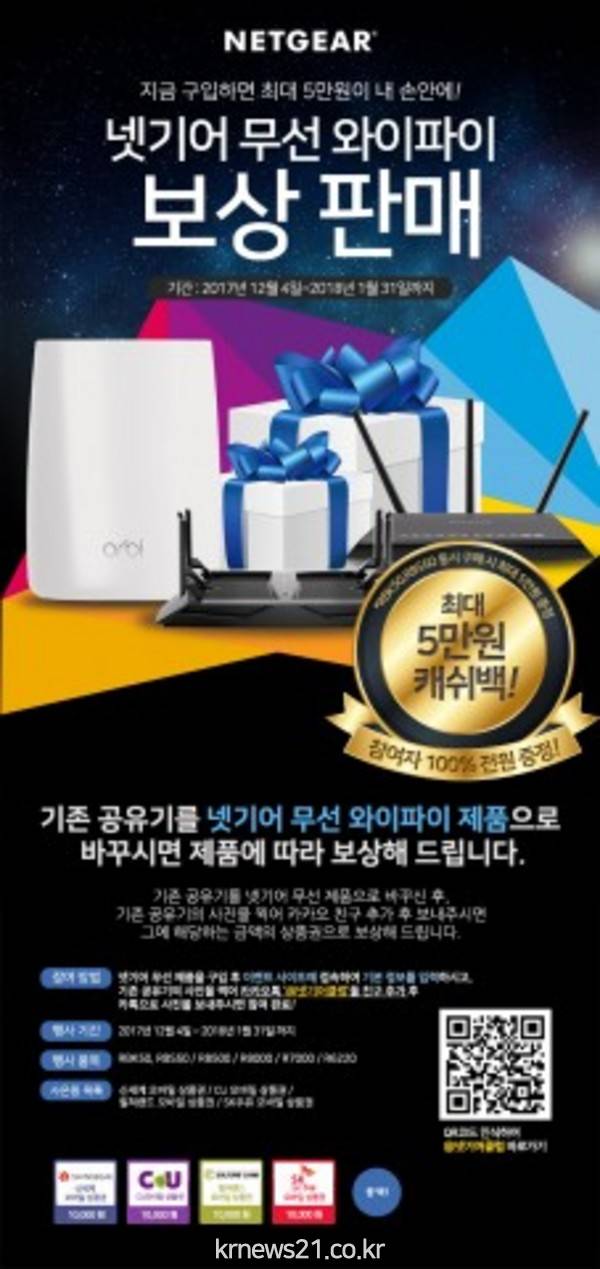 넷기어(NETGEAR 한국지사장 김진겸, 나스닥: NTGR)가 기존에 사용하던 공유기를 자사의 프리미엄급 무선 와이파이 공유기로 교체하면 최대 5만원의 보상금액을 백화점 상품권 혹은 주유 상품권 등 상품권으로 지급하는 ‘무선 와이파이 보상판매 이벤트’를 12월 4일부터 2018년 1월 31일까지 실시한다.
