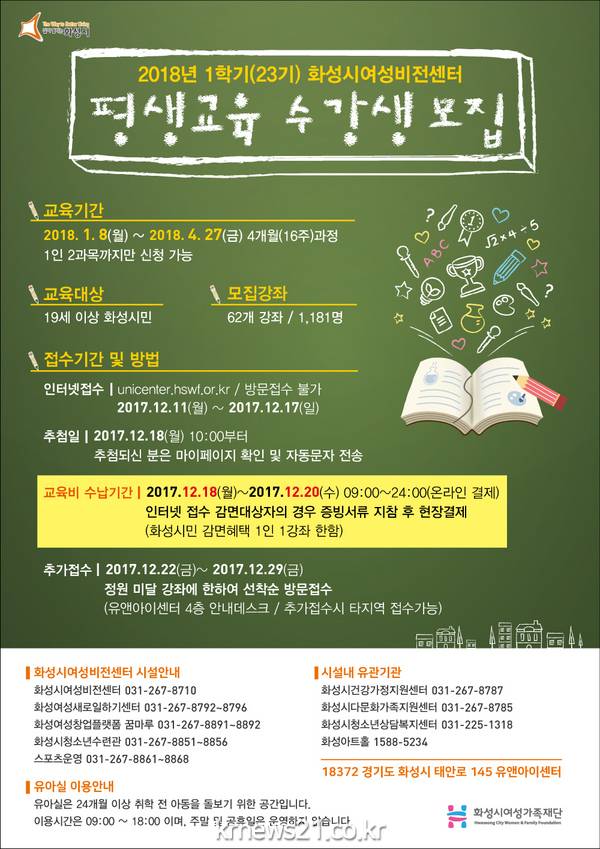 수강신청은 12월 11일부터이며, 19세 이상 화성시민이면 누구나 신청이 가능하다.