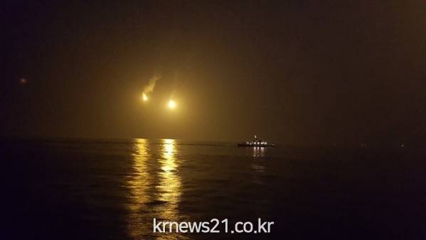 해경은 전날 오후 7시05분부터 40분간 항공기로 조명탄 56발을 투하하며 야간 수색을 하다 기상이 악화하자 한 때 수색을 중단하기도 했다. 또 전날 오후 45분부터 100t급 이하 소형함정은 피항했다.