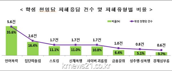피해 응답률은 학교급별로 볼 때 초등학교 1.9%(360명), 중학교 0.7%(129명), 고등학교 0.5%(68명) 순으로 조사됐다.