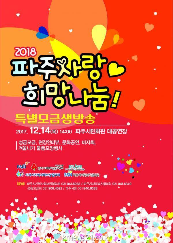 파주시는 오는 14일 오후 2시부터 4시까지 시민회관 대공연장에서 기관․단체, 기업체, 일반시민이 참여하는 '2018 파주사랑♡ 행복나눔!' 생방송모금행사를 개최한다.