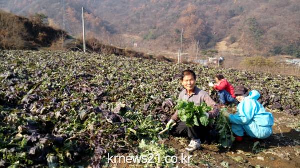 한창 하우스 갓 수확에 여념이 없는 홍성고 씨(군북면 자모리, 67)는 높은 인건비로 엄두를 못 냈던 수확작업을 생산적 일손봉사자를 지원받아 해결하며 시름을 덜었다.