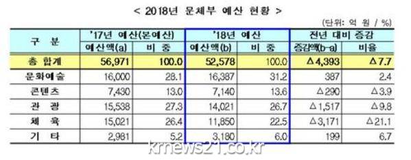 문체부 정책 담당자는 "2018년 예산에 국정과제 추진을 위한 필수 예산을 담아내는 데 주력했다. 2018년 예산은 새로운 문화정책의 토대를 쌓는 예산이 될 것"이라고 밝혔다.