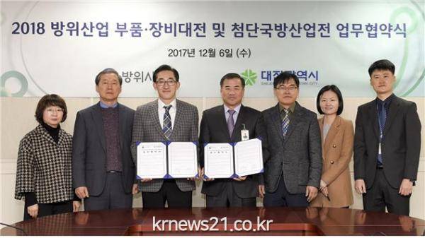 대전광역시는 지난 6일 방위사업청과 ‘2018 방위산업 부품·장비대전 및 첨단국방산업전 업무협약(MOU)'을 체결하고, 방위산업 부품 국산화 활성화와 대·중·소기업 간 상생협력 도모, 방위산업의 경쟁력 강화를 통한 수출 증대를 위해 함께 노력하기로 했다고 밝혔다.