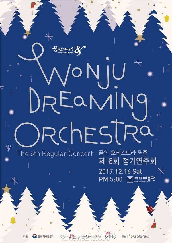 원주문화재단 관계자는 “2017년 한해동안 오케스트라 활동을 즐기면서 활동해준 단원들에게 감사하다”며 “이번 정기연주회에 많은 관객들이 찾아와 꿈의 오케스트라 단원들에 관심과 응원의 박수를 부탁한다”고 말했다.