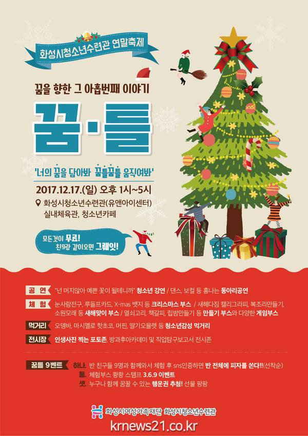 청소년이라면 누구나 와서 무료로 즐길 수 있는 ‘꿈을 향한 아홉 번째 이야기 ’꿈틀‘ 축제는 화성시가 주최하고 화성시청소년수련관이 주관하며 12월 17일 13시부터 17시까지 화성시청소년수련관(유앤아이센터)에서 개최된다. 자세한 내용은 유앤아이센터 홈페이지 정보마당-공지사항에서 확인가능하다.