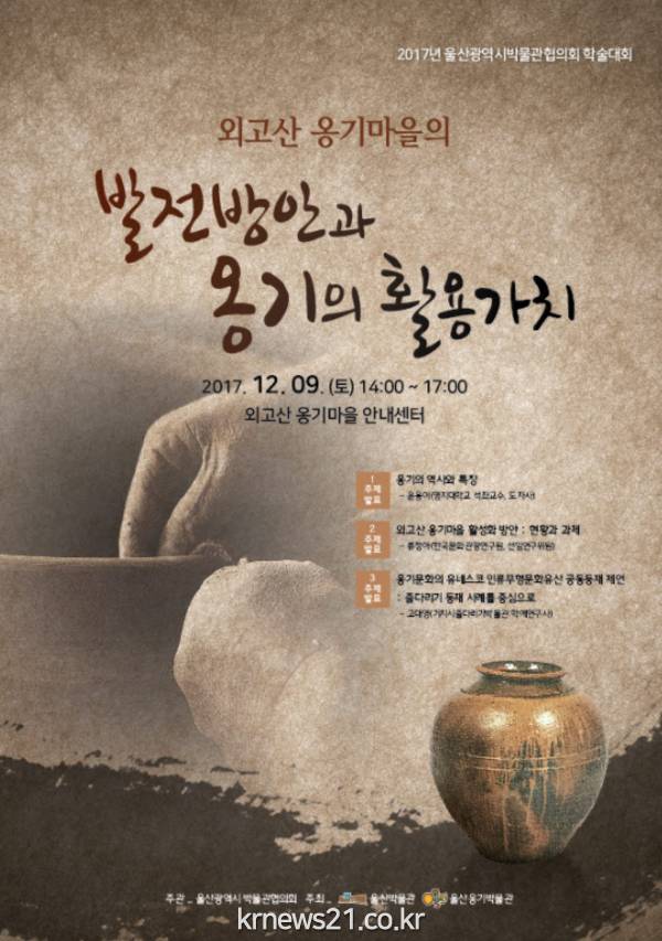 울산박물관은 12월 9일 오후 1시 30분 울산옹기마을 안내센터에서 ‘외고산 옹기마을의 발전방안과 옹기의 역사적 가치 ’라는 주제로 ‘2017년 울산시 박물관협의회 학술대회’를 개최한다고 밝혔다.