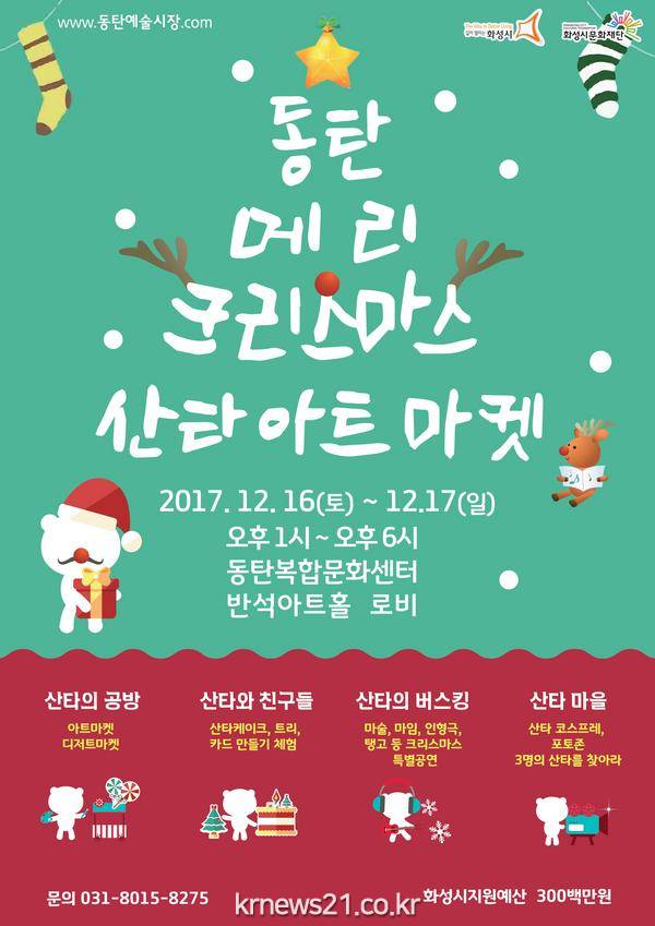 화성시 문화재단은 오는 16일(토)부터 17일(일) 오후1시~6시까지 양일간 <</span>동탄 메리 크리스마스~ 산타아트마켓>을 개최한다. 추운 겨울을 맞아 야외가 아닌 동탄 복합 문화센터 지하 1층 반석아트홀 로비 실내에서, 다양한 수제 먹거리와 크리스마스 관련 체험프로그램을 만날 수 있다.