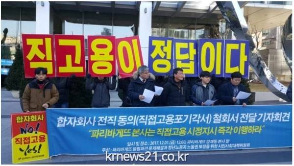 11일 민주노총 전국화학섬유노동조합 파리바게뜨 지회는 "이날 오후 2시에 협력업체를 제외한 가운데 서로 논의하는 자리를 갖자고 제안했지만 본사가 협력업체를 포함해야 한다며 이를 거절했다"고 밝혔다. 파리바게뜨 본사는 고용노동부의 제빵기사 5300여 명 직접고용 시정지시 이행기한이 만료된 지난 5일 노조 대표단·가맹점주협회·협력업체가 함께 직접고용 문제를 논의하는 자리를 제안했다. 협력업체 포함 여부를 두고 양측 입장이 평행선을 달리면서 이날 협상을 갖지 못했다.