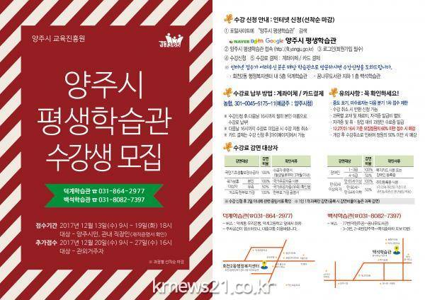 자세한 사항은 평생학습관 홈페이지(http://lll.yangju.go.kr)에서 확인하거나 덕계학습관(☎031-864-2977), 백석학습관(☎031-8082-7397)으로 문의하면 된다.