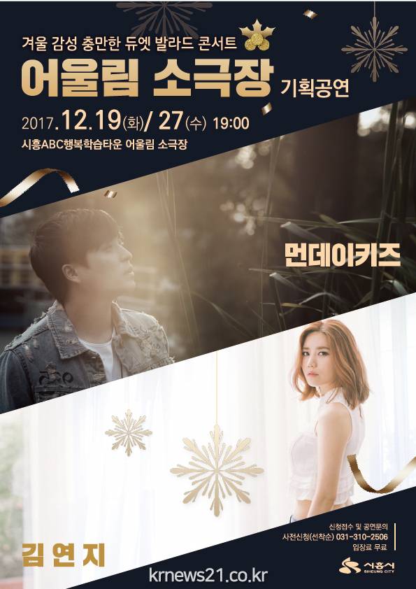 양일 모두 저녁 7시부터 8시 30분까지 진행되는 이번 공연은 김연지(前 씨야 메인보컬, MBC 제35대 복면가왕, KBS 불후의 명곡 우승)와 이진성(現 먼데이 키즈 메인보컬)이 함께하는 ‘겨울 감성 충만한 듀엣 발라드’ 소극장 콘서트를 선보일 예정이다.