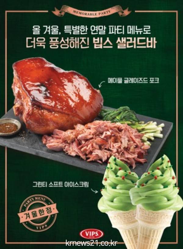 이 외에도 풍미가 깊은 치즈에 찍어 먹는 ‘소시지 퐁듀’, 상큼한 ‘만다린 젤로 펀치’, 크리스마스 트리를 연상시키는 ‘그린티 아이스크림’ 등 연말 분위기를 극대화할 디저트 메뉴도 함께 선보인다.