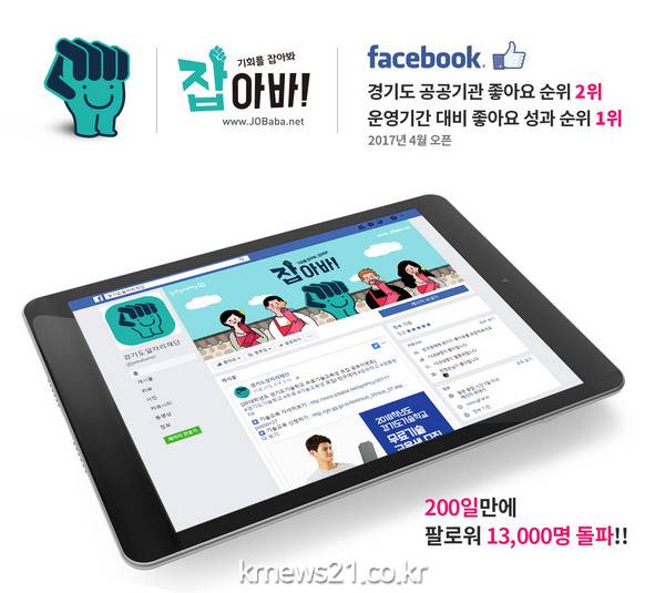 경기도일자리재단의 페이스 북(www.facebook.com/jobabanet/) 누적 구독자가 개설 200여일 만에 1만3,321명을 돌파하고 좋아요 수는 1만3,031건, 댓글 2만589개를 기록했다.
