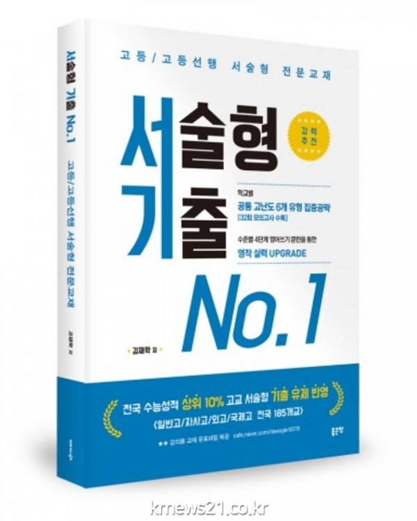 이러한 입시체계 아래에서 ‘서술형 기출 No.1’(김재학 저, 좋은땅)은 근본적인 영어쓰기능력을 키울 수 있도록 기출문제의 분석을 통해 영작에 필요한 핵심어법정리와 함께 수준별로 편성된 4단계의 영작 문항을 제시하고 있다. 무엇보다도 전국 수능성적 상위 10% 내의 185개 고등학교의 서술형 문제를 직접 수집·분석하였고, 이를 기초로 제작된 학교별 공통고난도 6개 유형의 집중공략을 위한 32회 모의고사는 실전 기본서로서의 가치를 높이고 있다.
