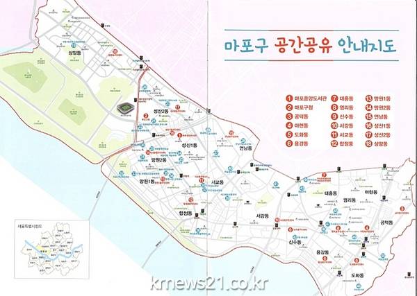 공간공유 안내지도는 2014년에 이어 두 번째로 제작됐다. 올해는 주민센터의 이전으로 인한 내용 미수정을 보완하고, 마포중앙도서관 등 개방 시설을 추가했다.