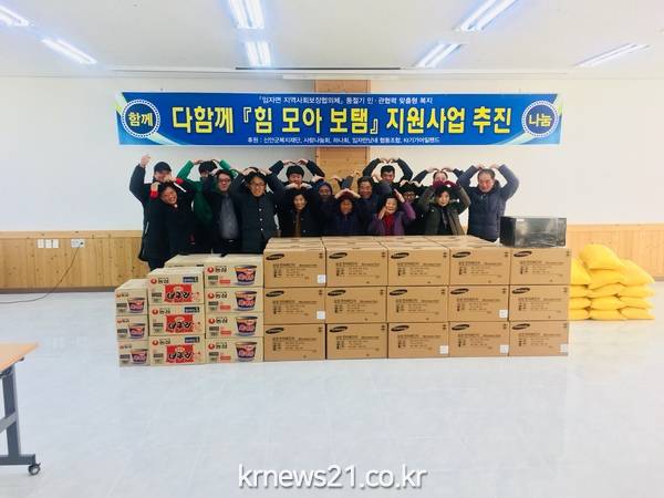 다함께 힘모아 보탬지원사업은 지역나눔형복지 활성화를 위하여 민간자원을 최대한 활용하고 십시일반 모은 기부금액을「재단법인 신안군복지재단」에 지정기탁하여 매칭사업으로 이번 첫 사업은 「임자면 사랑나눔회」에 적립된 금액을 기부하여 저소득층 주민 40세대에게 전자레인지를 전달하였고 「임자면여성단체협의회」에서는 쌀(20㎏ 기준) 13포, 「임자하나회」라면/30박스,「신안군복지재단」에서 쌀(10㎏ 기준) 58포를 전달하여 훈훈한 감동을 남겼다.