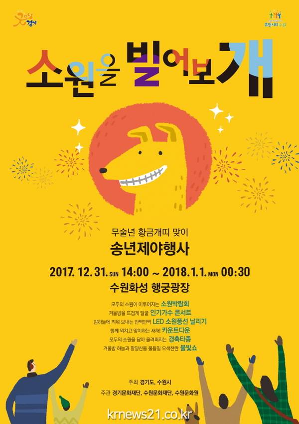 경기도와 수원시, 경기문화재단, 수원문화재단, 수원문화원은 오는 31일 수원 화성행궁 광장에서 ‘소원이 이루어지는 2017 송년 제야행사’를 개최한다.