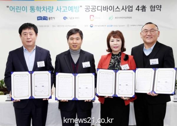 경기 용인시는 19일 시청 시민사랑방에서 아바드, 재단법인 행복한에코폰, 용인시어린이집연합회와 ‘어린이통학차량 사고예방 공공디바이스사업’ 업무협약을 체결했다.