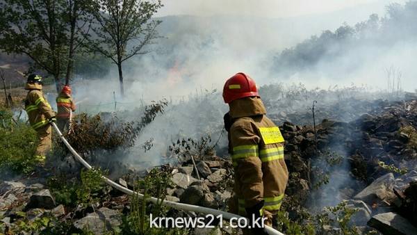 경북 포항시 야산에서 원인을 알 수 없는 불이 났다. 5시간 만에 큰 불길은 잡고 잔불을 정리 중이다.