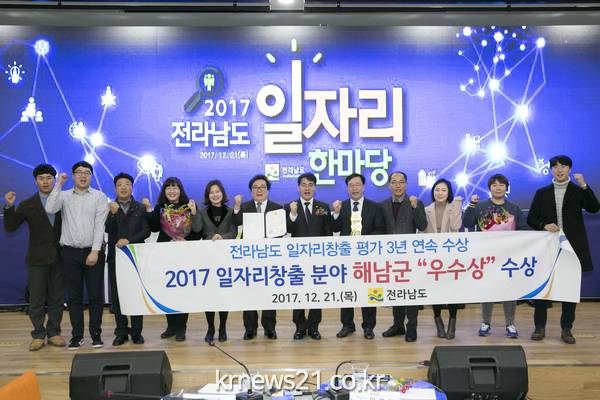 해남군은 올해까지 3년연속 전라남도 일자리 창출 우수시군에 선정된 가운데 올해 시상식은 21일 나주시 혁신도시 한국전력에서 개최된 2017년 전라남도 일자리한마당 행사에서 개최됐다.