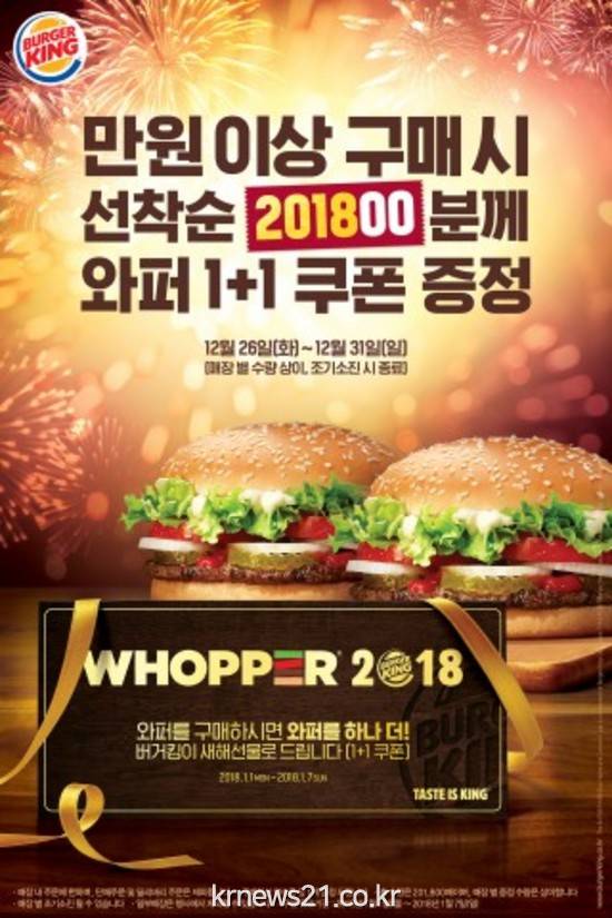 먼저 1만원 이상 구매 시 버거킹 대표 메뉴인 와퍼 1+1 쿠폰을 증정한다. 다가오는 2018년을 힘차게 시작하는 의미로 총 20만1800장의 쿠폰을 마련했고 이 쿠폰은 선착순 20만1800명의 고객에게 증정될 예정이다. 쿠폰의 수량은 매장별로 상이하며 행사는 각 매장의 재고 소진 시까지 실시된다.