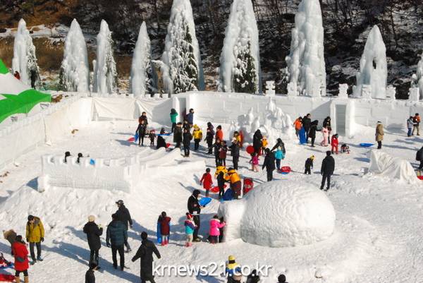 축제는 포천의 자연환경을 그대로 살려 생각만 해도 웃음이 절로 나는 전통 놀이를 중심으로 이뤄졌다. 동장군의 고장답게 축제현장에서 가장 눈에 띄는 것은 입구주변을 장식한 얼음꽃나무. 대여섯 그루의 침목수가 온통 얼음을 뒤집어쓰고 서있다. 얼음 꽃을 피워내기 위해 몇 날 몇 밤을 분수로 물을 뿜어내 자연결빙이 되도록 했다. 그렇게 해서 피워낸 얼음꽃나무가 주변의 계곡눈썰매, 추억의 얼음썰매, 얼음낚시터 등을 아름답게 장식하고 있다.