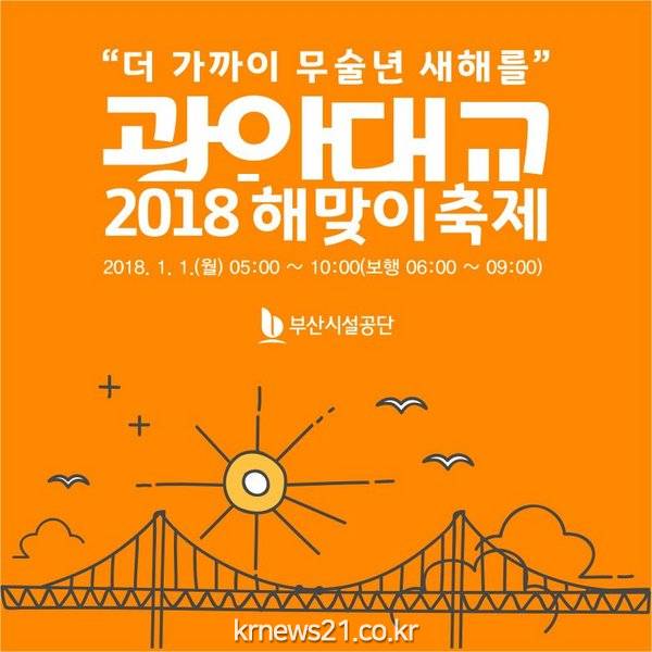부산시설공단(이사장 김영수)은 2018년 무술년 새해를 맞아 광안대교 교량에서 ‘희망부산 카운트다운’과 ‘해맞이축제’를 연이어 개최한다고 26일 밝혔다.