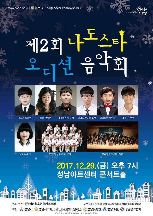 성남청소년오케스트라(상임지휘자 박용준)가 주최, 성남시, 성남청소년재단 등이 후원하는 제2회, ‘나도 스타 오디션 음악회’가 12. 29(금) 오후7시, 성남아트센터 콘서트홀에서 열린다.