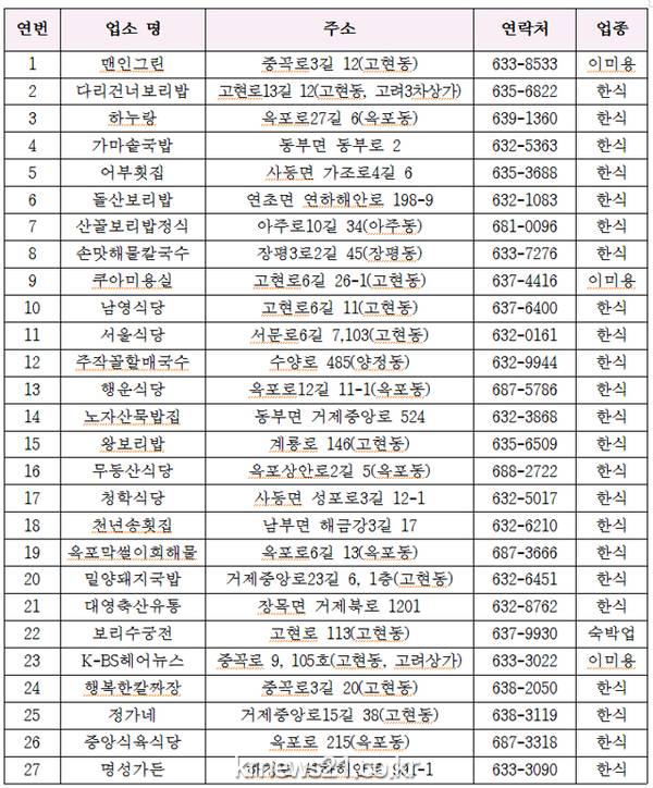 거제시는 2017년 착한가격업소에 K-BS헤어뉴스, 행복한칼짜장, 정가네, 중앙식육식당, 명성가든을 신규 지정했다.