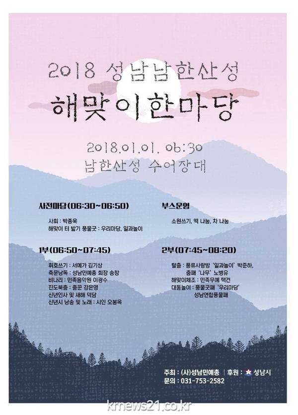 2018년 1월1일 새해를 맞아 (사)성남민예총(회장 송창)에서 제23회 성남 남한산성 해맞이한마당이 남한산성 수어장대에서 개최한다.