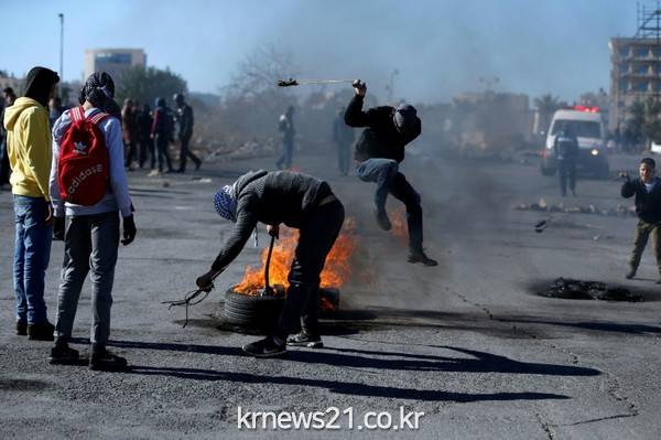 ▲ AFP / ABBAS MOMANI [제공자ⓒ 뉴스21통신. 무단전재-재배포 금지.]이스라엘 보안군과 충돌한 라말라의 팔레스타인 시위대들은 다른 곳에서 발포하고 있다.