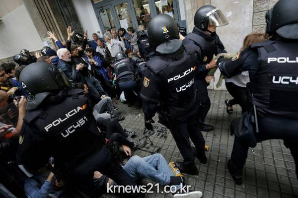 ▲ AFP / PAU BARRENA [제공자ⓒ 뉴스21통신. 무단전재-재배포 금지.]화요일, 스페인 정부는 독립 투표를 앞두고 카탈로니아로 보낸 경찰력을 철수시켰으며, 국민 투표일에 카탈로니아의 스페인 경찰은 충격적인 사진을 제공하였다.