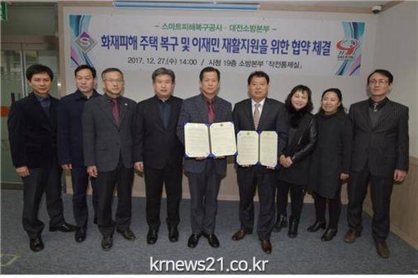 대전광역시 소방본부는 화재로 인해 삶의 터전을 잃어 실의에 빠져있는 이재민의 주택 수리, 도배 등의 지원을 통해 조기에 생활안정 기반을 마련해 주고자 지난 27일 스마트피해복구공사와 업무협약을 체결하고 이재민 돕기에 상호 협조키로 합의했다고 밝혔다.