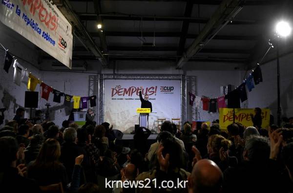 ▲ AFP/Archivos / Lluís Gené [제공자ⓒ 뉴스21통신. 무단전재-재배포 금지.]지난 16일 바르셀로나에서 열린 카를레스 리에라 카탈로니아 지역 선거에서 CUP의 후보가 연설하는 모습.