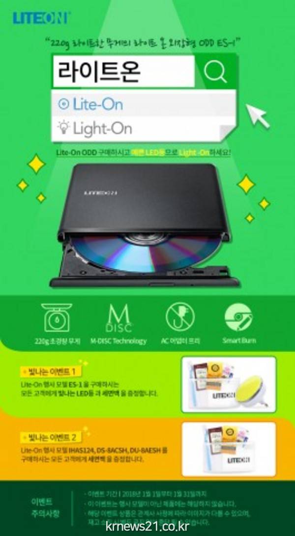 ㈜태진금속(대표이사 안태균)과 ㈜이선디지탈(대표이사 정현수)이 신제품 ODD 출시를 기념해 ES-1 모델 외 3종 구매 이벤트 ‘Lite-On, Light-On’을 실시한다.