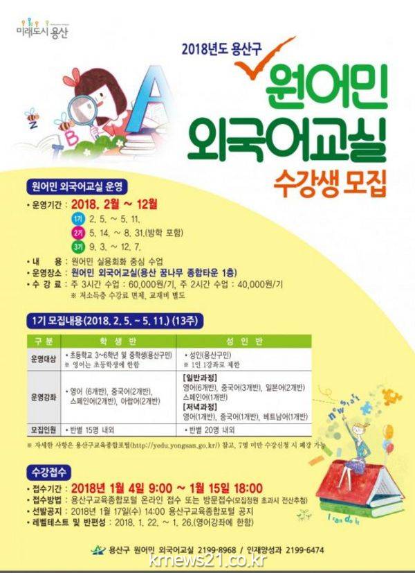 용산구(구청장 성장현)가 4일부터 15일까지 원어민 외국어교실 수강생을 모집한다.