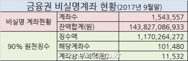 금융실명제가 시행된지 25년이 넘었음에도 여전히 존재하는 비실명계좌가 154만개에 달하는 것으로 나타났다.