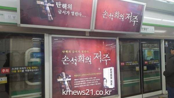 대구 도시철도 2호선 반월당역에 게시된 광고가 시민들의 항의로 1시간 만에 철거됐다. 논란이 된 광고판은 ‘손석희의 저주’라는 도서 광고로 변희재 미디어워치 대표고문의 저서다.