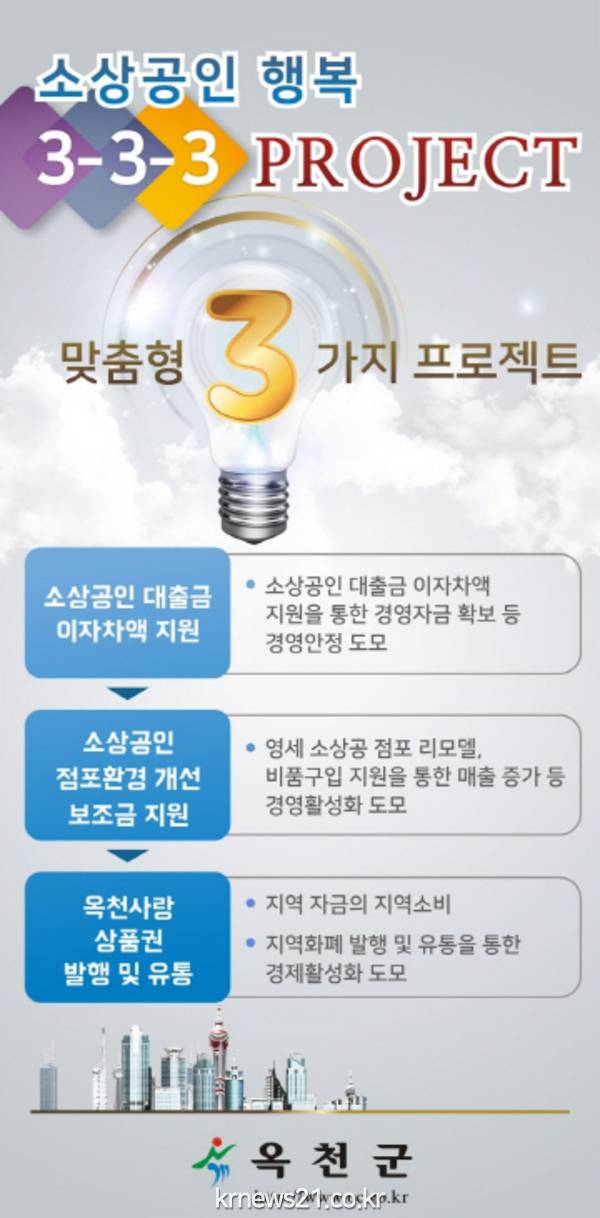 '소상공인 행복 3-3-3 프로젝트'는 옥천군에 3개월 이상 거주 및 사업장을 영위하고 있는 소상공인과 3년 이상 거주 및 3년 이상 사업장을 경영하고 있는 소상공인들을 위한 3가지 지원책을 뜻한다.