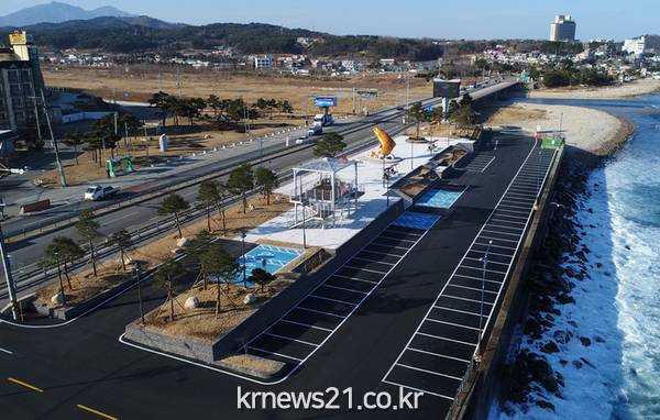 강원 양양군을 통과하는 국도 7호선 북단에 자리잡고 있는 강현면 물치주차장이 쾌적한 해안 공원으로 새롭게 태어났다.