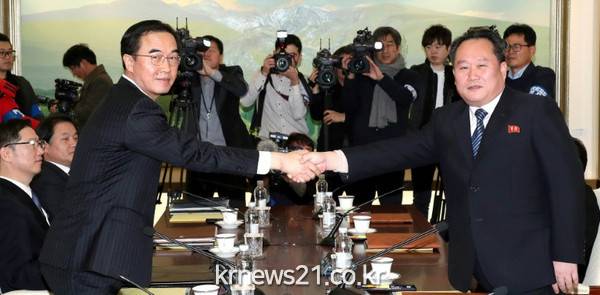 ▲ AFP / Dong-A Ilbo [제공자ⓒ 뉴스21통신. 무단전재-재배포 금지.]북한과 남한의 고위급 대표들이 직접 회담을 위해 화요일에 약 2년 만에 처음으로 만났다. 주요 주제는 다음달 남한에서 열릴 올림픽 대회에 북한이 참여할 가능성이었다.