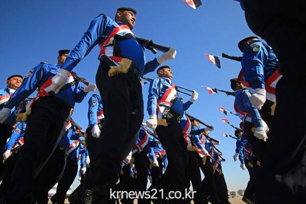 이라크 경찰은 남부 도시 바스라에서 국가 경찰의 날을 기념하기 위해 퍼레이드에 참가한다.
