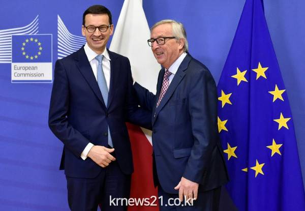▲ AFP / JOHN THYS [제공자ⓒ 뉴스21통신. 무단전재-재배포 금지.]폴란드의 마테우시 모라 비치 수상과 장 클로드 융커 유럽 위원회 위원장은 브뤼셀에서 긍정적인 평가를 하며 회담을 가졌다.