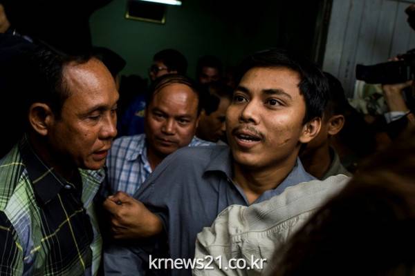 ▲ AFP / Ye Aung Thu [제공자ⓒ 뉴스21통신. 무단전재-재배포 금지.]2017년 12월 27일 랑군의 한 법원에 출두할 때 그들 중 한명인 버마 경찰은 로이터 통신사의 두 기자들이 버마 서부 지역에서 발생한 인종 청소 사건에 대한 수사의 일환으로 국가 기밀을 침해했다고 비난했다.