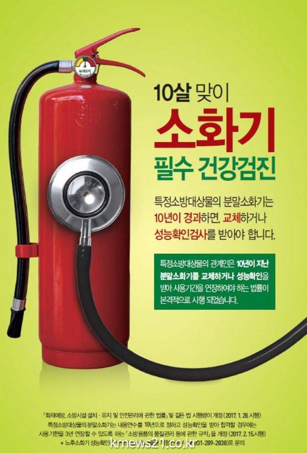 특정소방대상물 관계인은 개정된‘화재예방, 소방시설 설치 유지 및 안전관리에 관한 법률’시행(2017.1.26.)에 따라 1년의 유예기한을 거쳐 오는 1월 28일까지 10년이 지난 분말소화기를 교체하거나 성능확인검사를 받아 사용기간을 연장해야 한다.