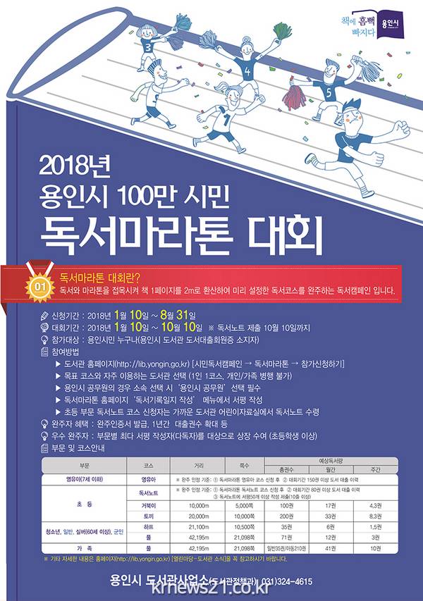 용인시는 시민들의 책 읽는 문화를 확산하기 위해 지난해 처음 실시한 독서마라톤 대회를 올해에도 개최키로 하고 오는 10일부터 신청자를 접수한다고 밝혔다.