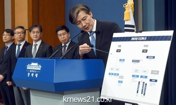 조국 청와대 민정수석은 이날 청와대 춘추관에서 직접 브리핑을 갖고 국정원, 검찰, 경찰 등 3개 권력기관에 대해 이 같은 개혁방안을 발표했다. 문재인정부가 기존에 밝혀온 내용이지만 경찰 비대화를 견제하는 방안이 구체화됐다. 이와관련 청와대의 최고책임자격인 조 수석이 새해 들어 처음 개혁의 의미와 청와대 의지를 밝히며 힘을 실었다.