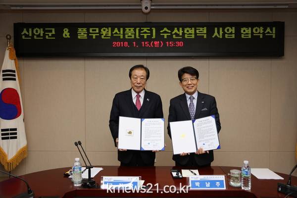 신안군과 풀무원식품(주)는 신안군에서 생산‧가공되는 우수 수산물 및 수산식품의 협력사업을 통해 상호 공동이익과 발전을 추구하고자 ‘18. 1. 15(월) 신안군청 회의실에서 『수산협력사업 업무 협약』을 체결하였다.