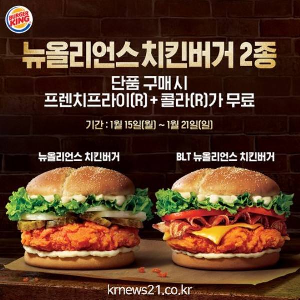 프리미엄 햄버거 브랜드 버거킹이 카카오톡 플러스 친구 소비자를 대상으로 15일부터 21일까지 1주간 뉴올리언스 치킨버거와 BLT뉴올리언스 치킨버거 단품 주문 시 사용 가능한 프렌치프라이(R)와 콜라(R) 무료 쿠폰을 제공한다.